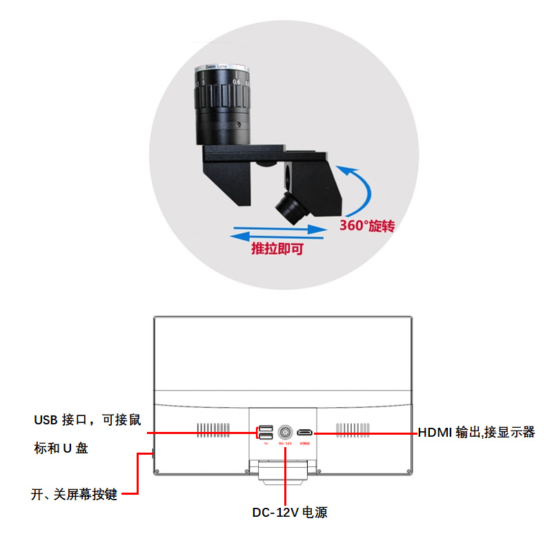 ATE-25DM高清2D/3D視頻電子顯微鏡 與11.6寸一體式顯示屏連接,操作方便可拍照錄像測量,存儲在U盤,無需電腦