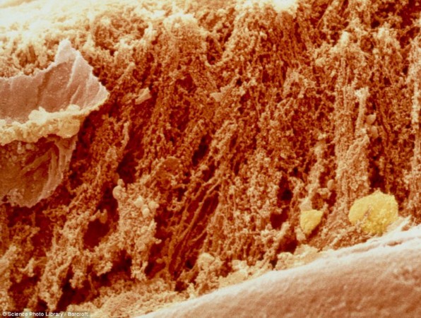 一條巧克力棒看起來就像綠色的火山口。 生肉在顯微鏡下的狀態(tài),可以看到脂肪纏繞在肌肉周圍。